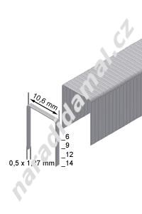 Sponky typ PF. Síla drátu 0,5 x 1,27 mm. Šíře 10,6mm, délka 9 mm.