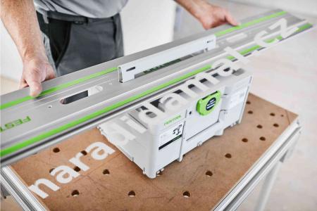 Vynalezená a zdokonalená firmou Festool: vodicí lišta s lepicími podložkami. Umožňuje rovné a přesné řezy při práci ve vodorovné poloze na podlaze nebo na pracovní ploše a při použití na stěně. Jednoduché upevnění na různé povrchy pomocí lepicích podložek. Jednoduchá a praktická přeprava dvou vodicích lišt v držadle Systaineru.