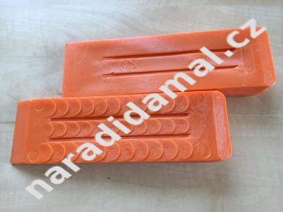 Pomůcka pro kácení stromů. Zamezuje sevření lišty. Používá se do hlavního řezu pro směrové kácení. Délka 24 cm. Vyrobeno z tvrzeného plastu. Hmotnost 450 g.